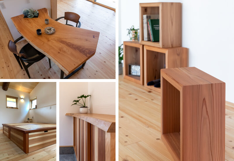 空間を生み出すのが建築であるならば、家具は暮らしを生み出す『具』となります。住まい手の暮らしや、好みに合わせた「オーダーメードの造作家具」を、吟味した素材を使って設計から制作まで自社工場にて行います。使用する人の背丈に合わせたカウンターデスクや素材の良さをそのまま活かしたダイニングテーブル、ライフスタイルにぴったりの収納など、住まい手にとっての「ちょうどいい」を実現するための、機能的な住まいの『具』を提供いたします。